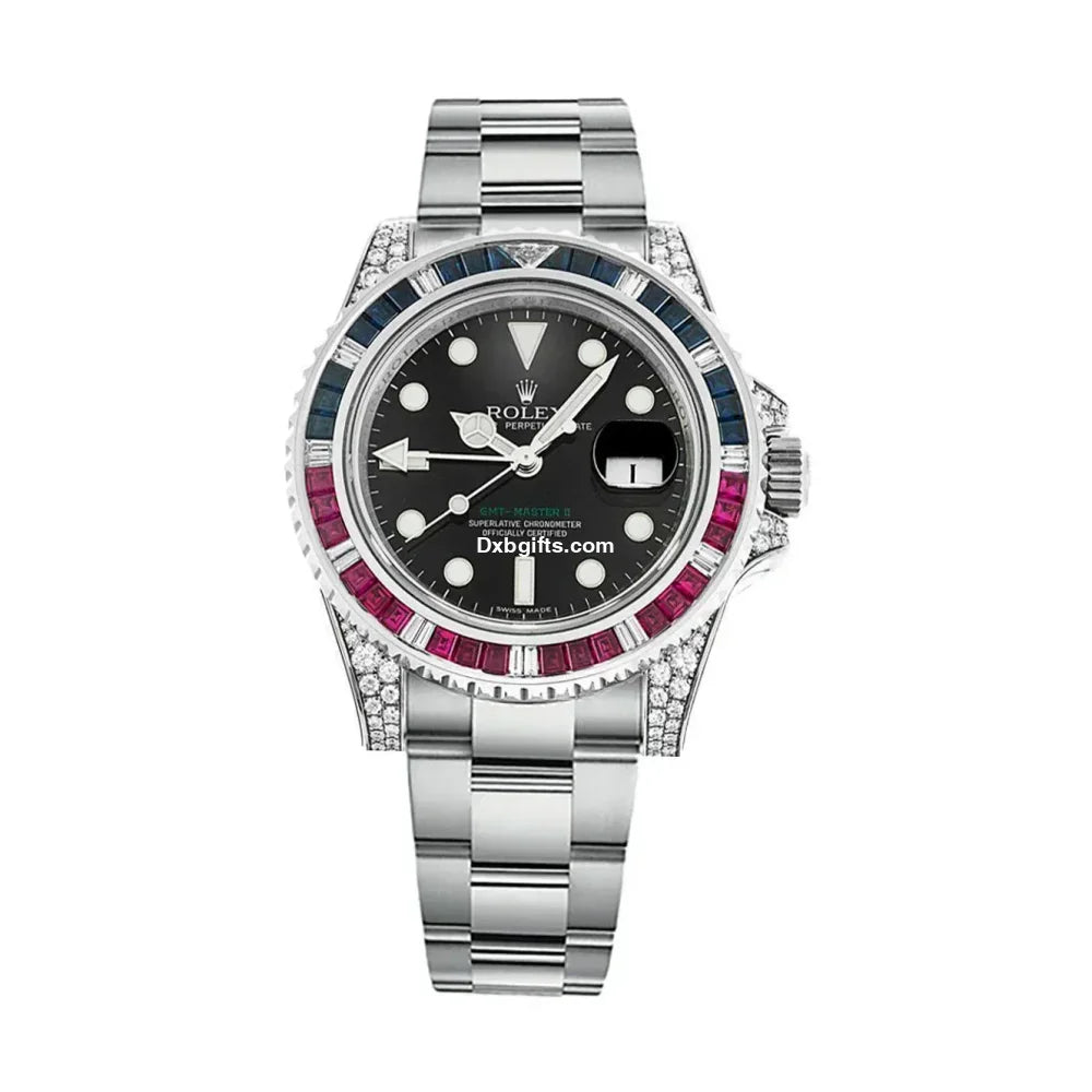 The Rlx Oyster bracelet, also crafted in white gold, provides comfort and security with its Oysterlock folding clasp. The diamond-set bezel elevates this Gtm II, making it not only a functional timepiece but a true statement of luxury.