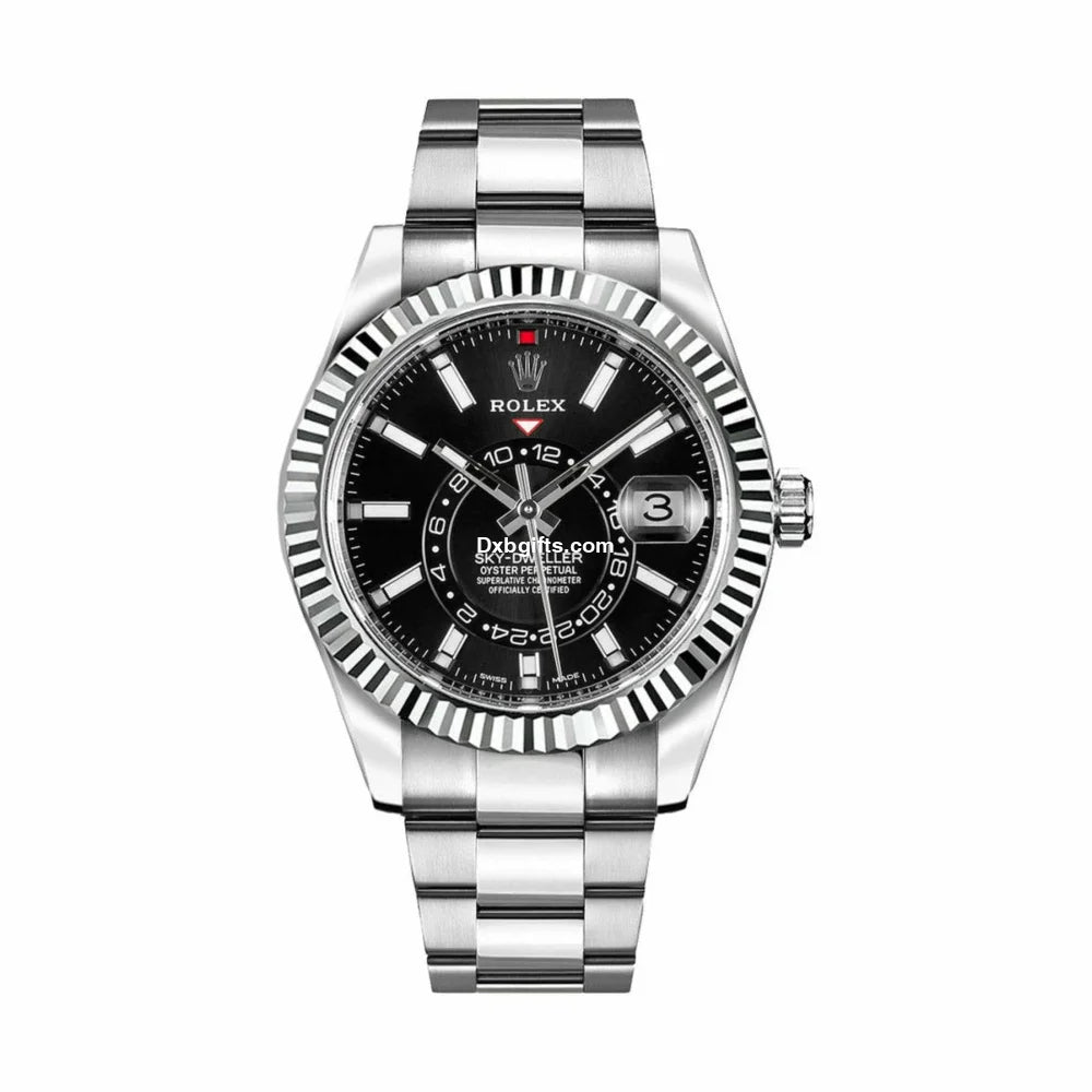 42mm white Rolesor case comprised of a 904L steel monobloc middle case, screw-down back, screw-down crown, 18K white gold fluted bezel with bidirectional rotatable Rlx Ring Command, scratch-resistant sapphire crystal with cyclops lens over the date and double anti-reflective coating, black dial, index hour markers, Rlx calibre 9001 automatic movement , second time-zone displayed via off-center rotating disc, Saros annual calendar with date at 3 o'clock and month indicated in discrete apertures at each of the 12 hour marks, stainless steel Oyster bracelet, folding Oysterclasp buckle with Easylink 5mm comfort extension link. Waterproof to 100 meters.